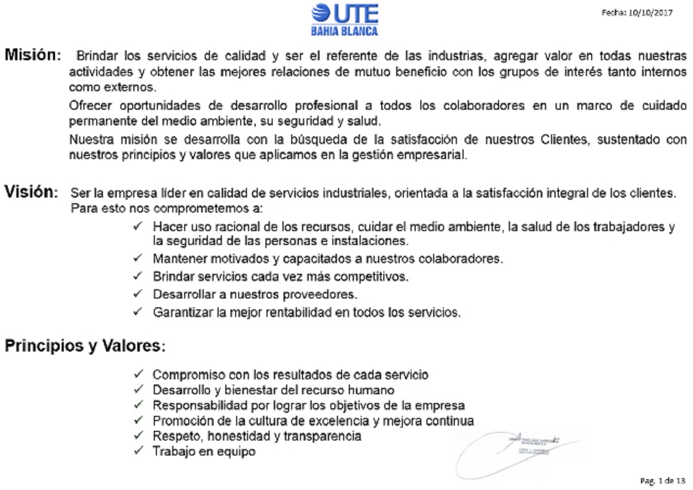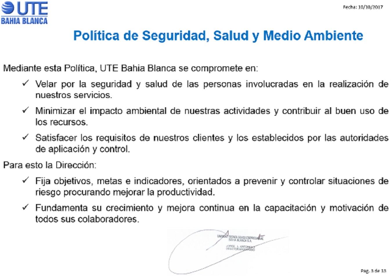 Política de Calidad – Política de Seguridad, Salud y Medio Ambiente – Misión, Visión y Principios y Valores