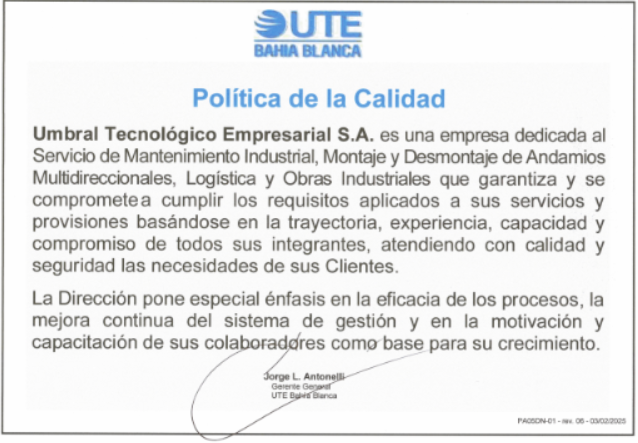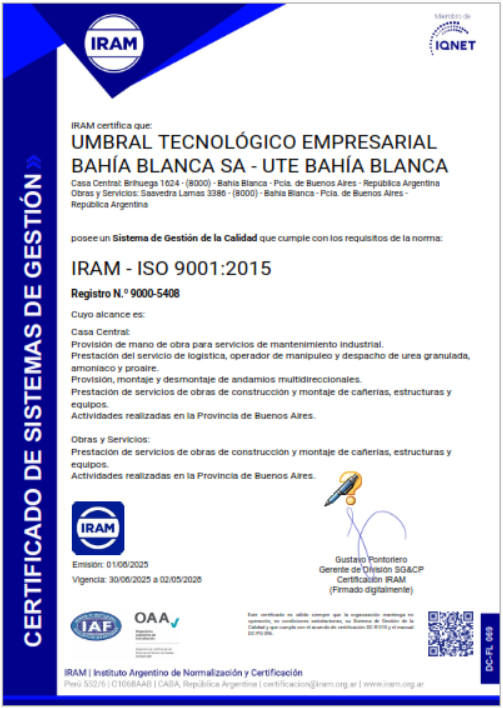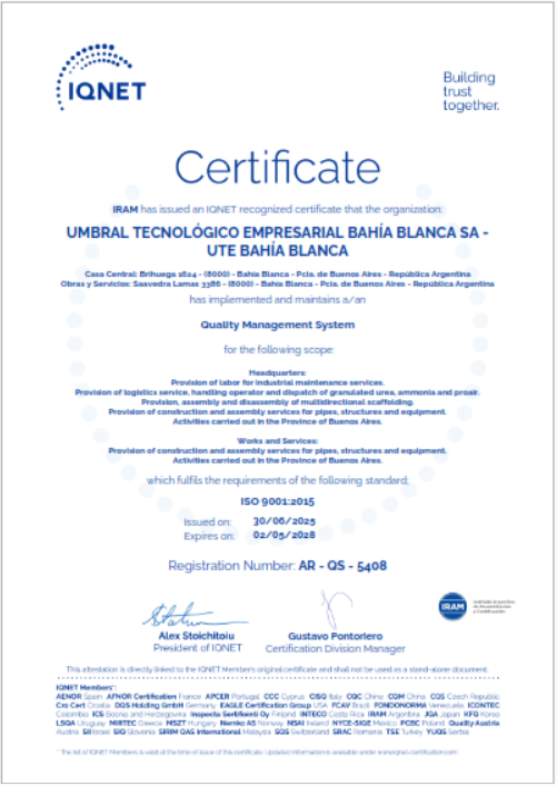 Umbral Tecnológico Empresarial S.A. se encuentra en la actualidad con Certificación de la Norma ISO 9001:2015 ( Control de Calidad )